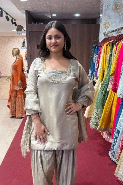 Kurti: Short silk kurti adorned with intricate embroidery, offering a refined and festive appeal.