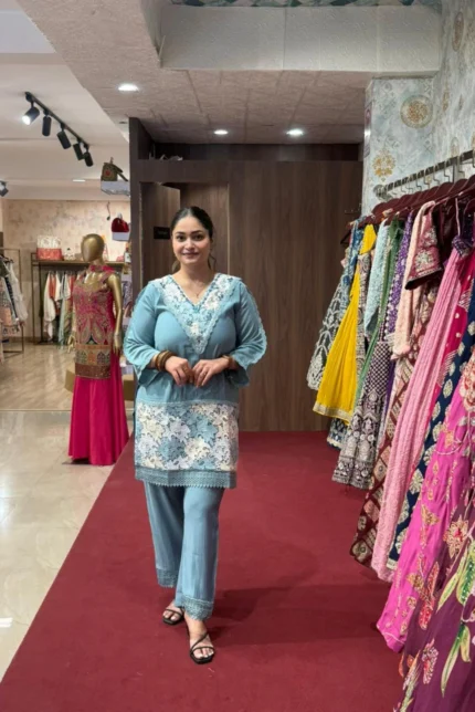 Blue Sequence Embroidery Short Kurti with Pant Co-ord Set