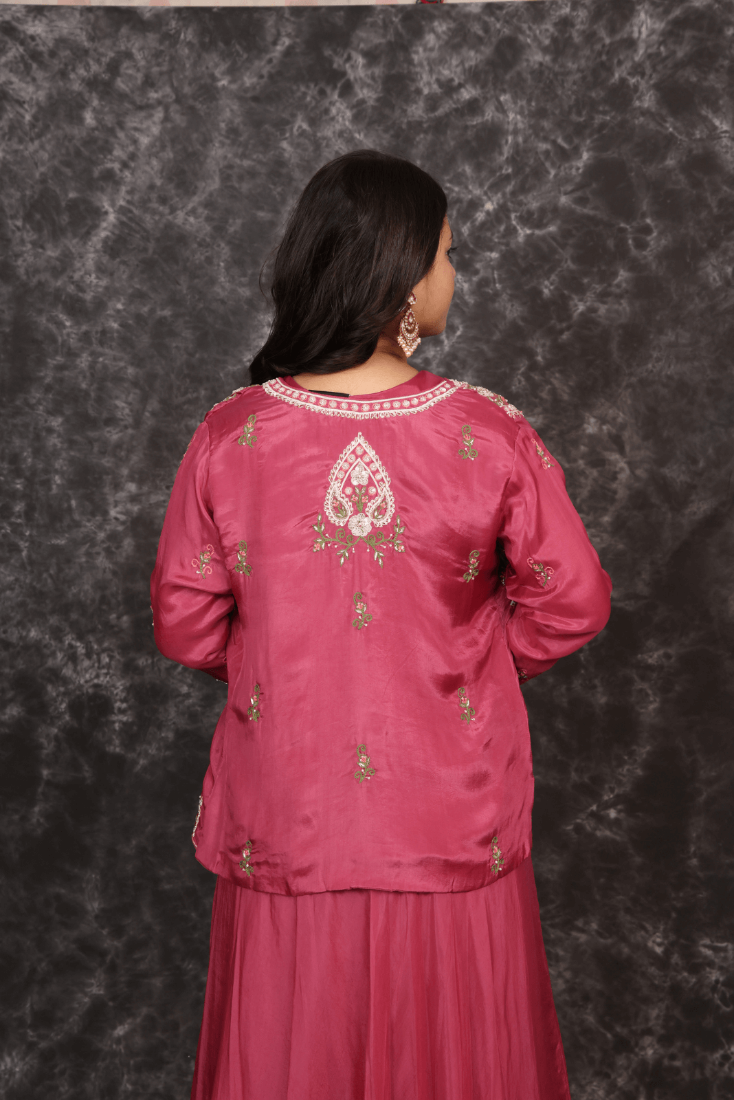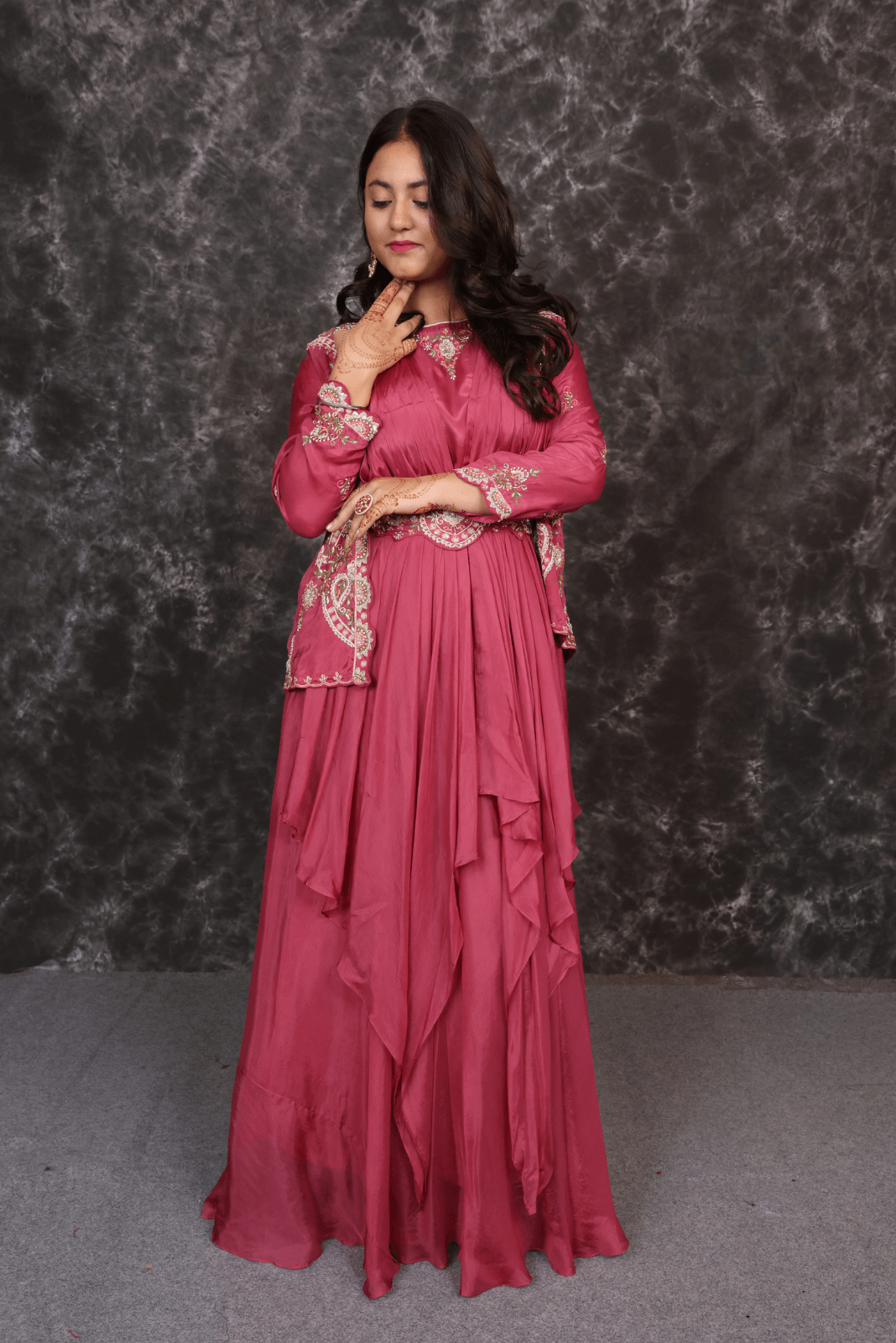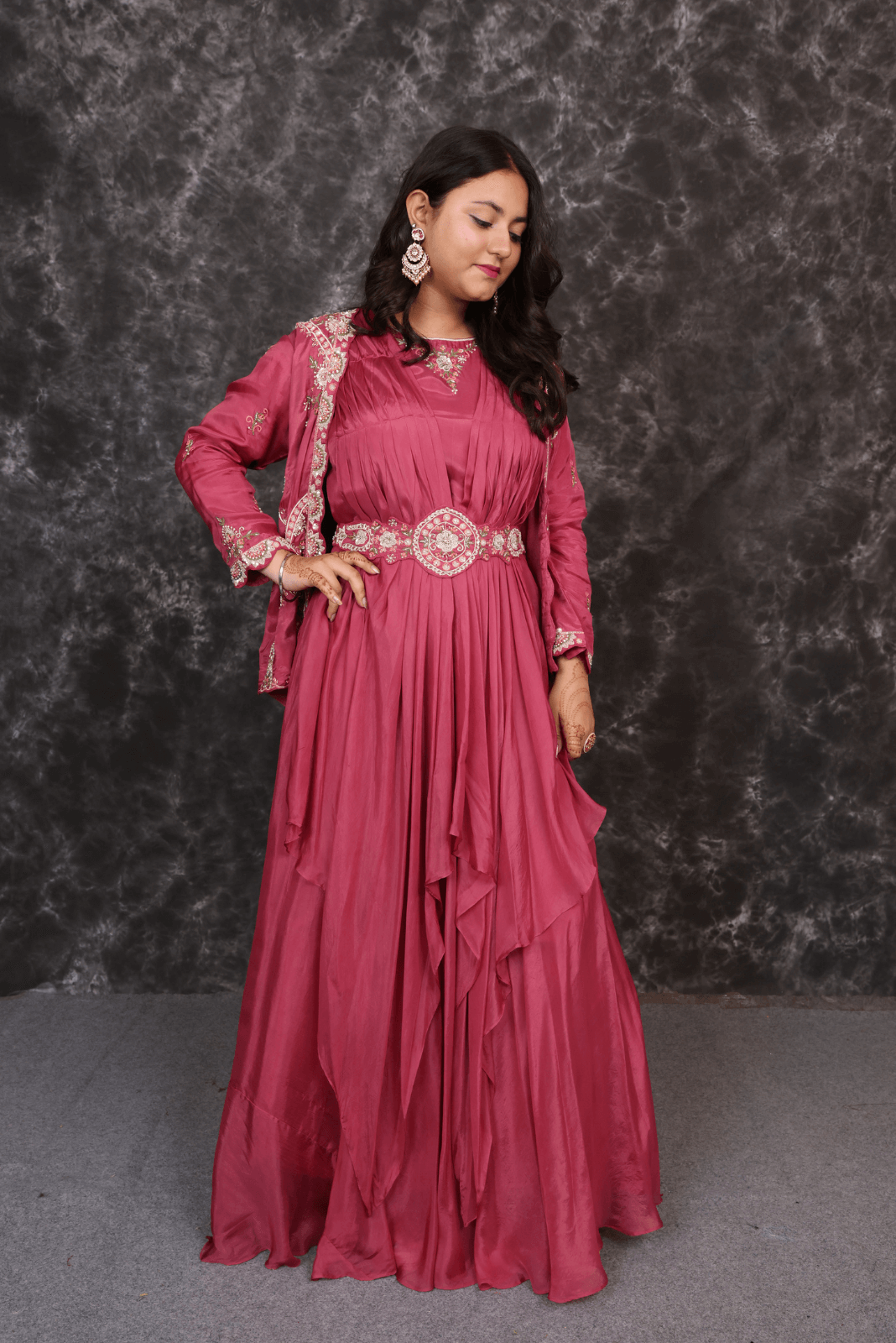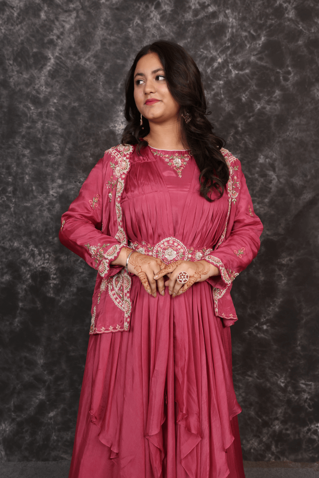 Step into effortless elegance with this stunning Cowl Style Gown paired with a Matching Jacket. Designed in a soft and graceful onion pink shade, this outfit blends modern draping with timeless sophistication. The cowl-style fall of the gown adds fluid movement, while the structured crepe jacket enhances the look with a stylish, contemporary edge.