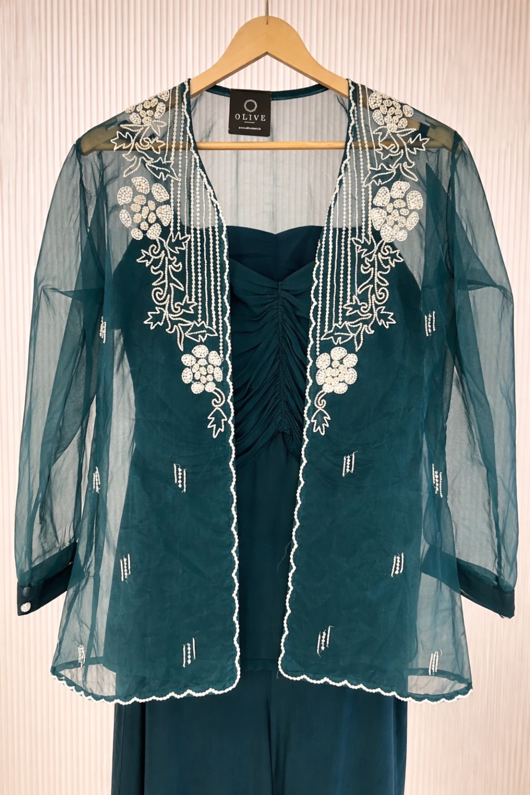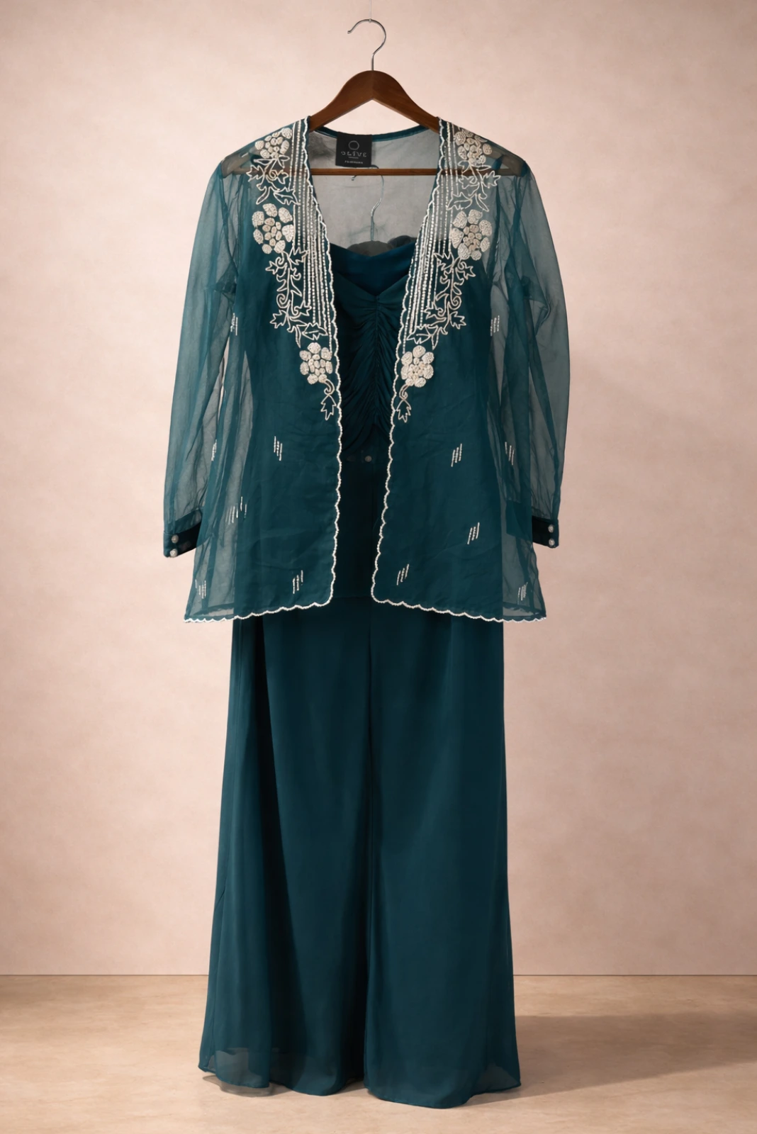 This Teal Crop Top Plazo with Jacket is designed for modern celebrations with a touch of sophistication. The chinon crop top and plazo offer a smooth, flowy fall, while the organza jacket enhances the outfit with a delicate layered appeal. A perfect pick for festive occasions, parties, and wedding functions.