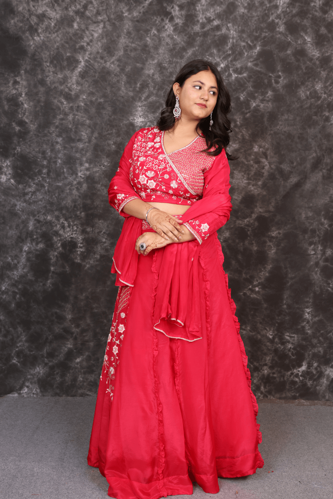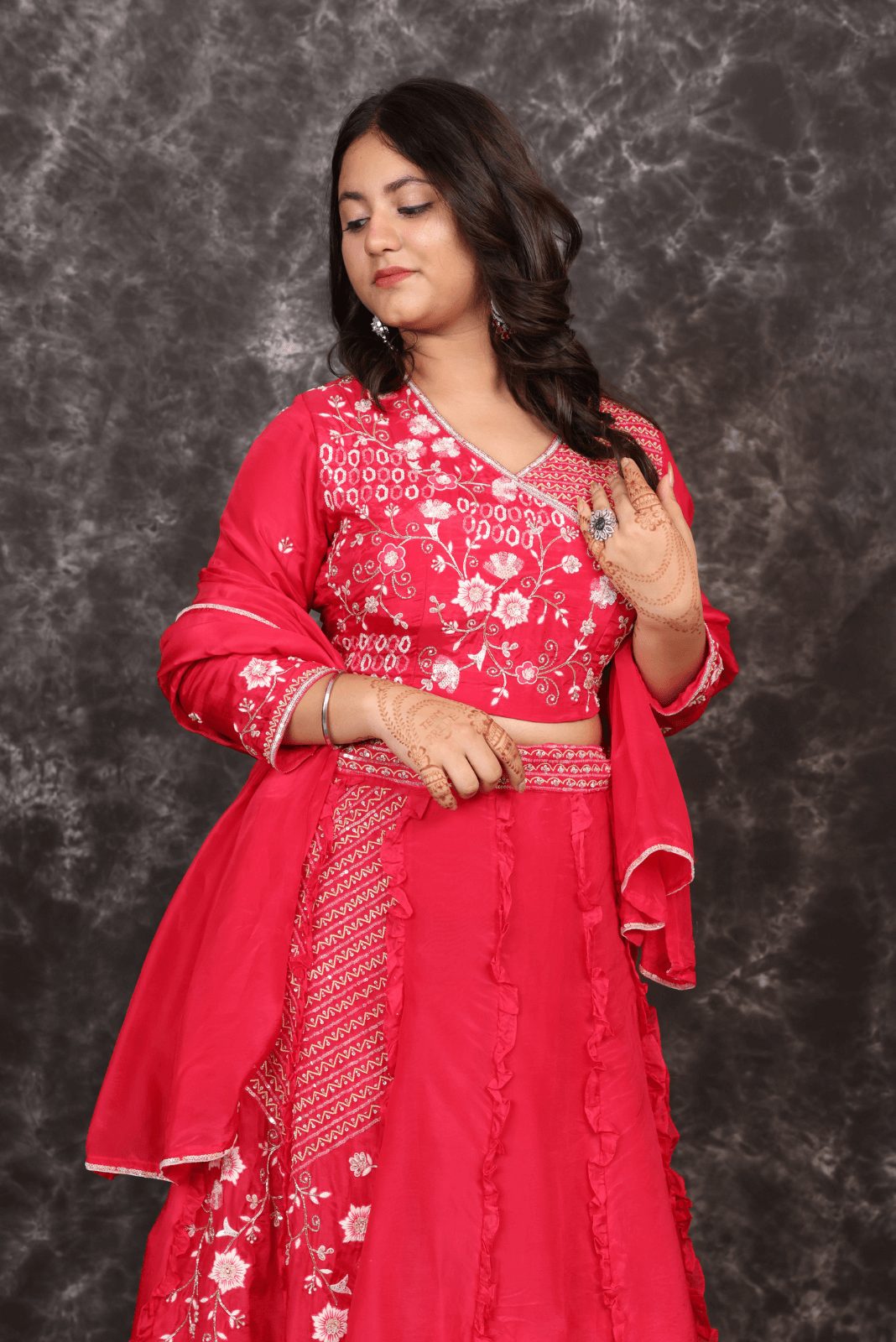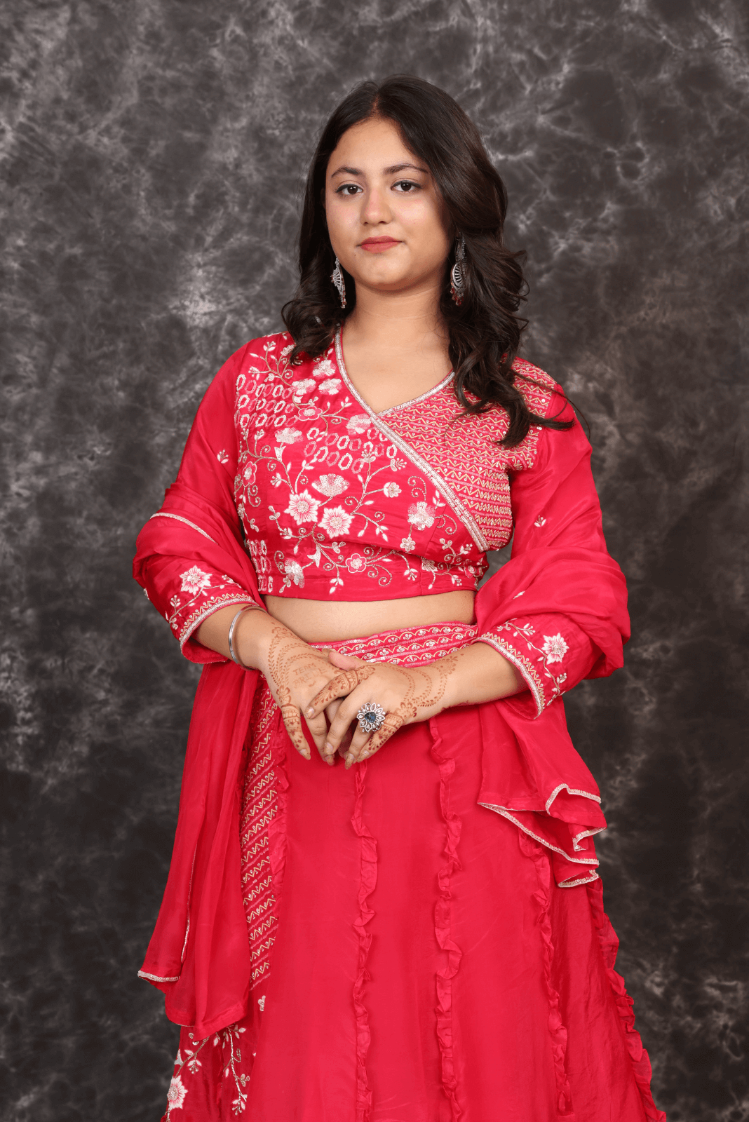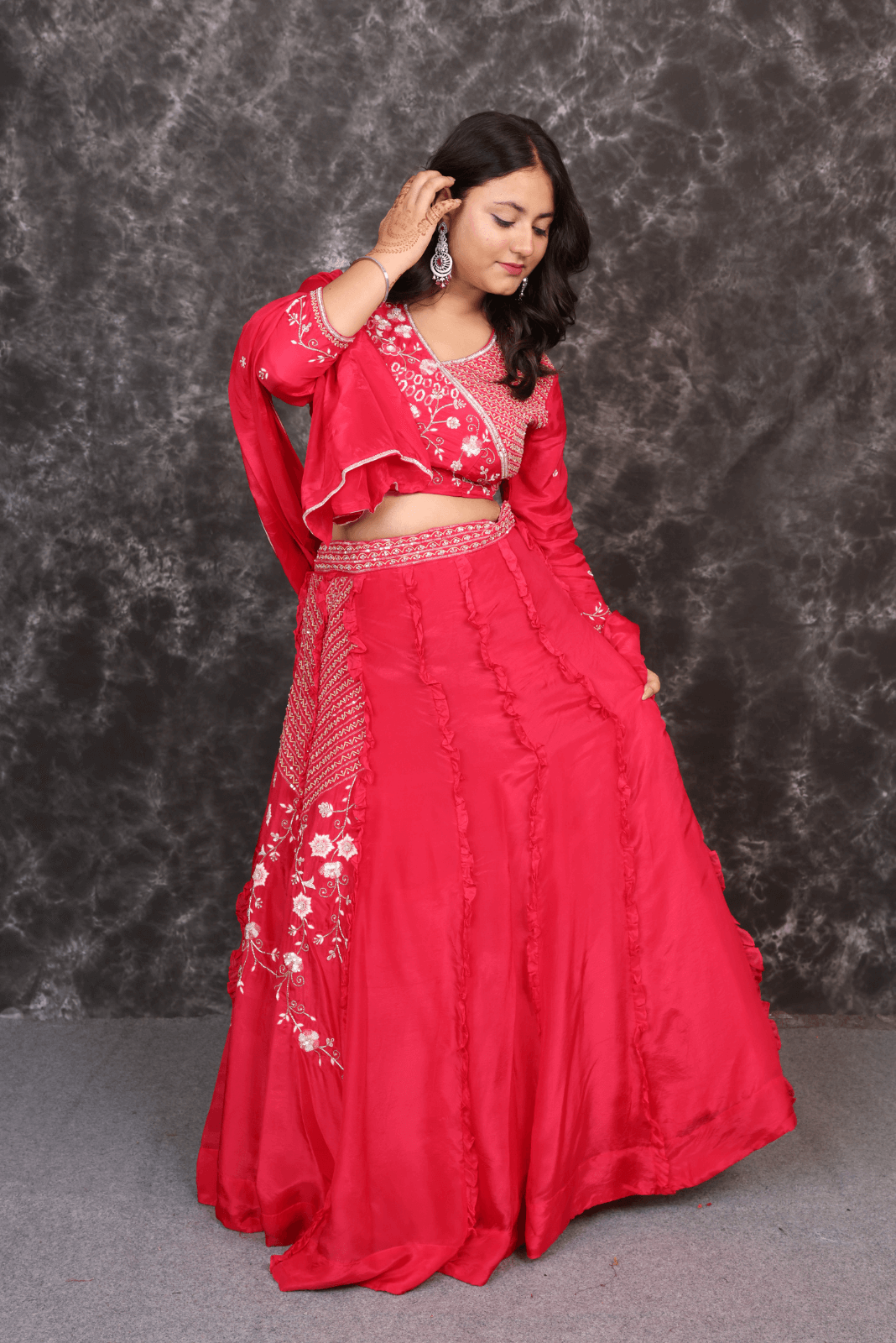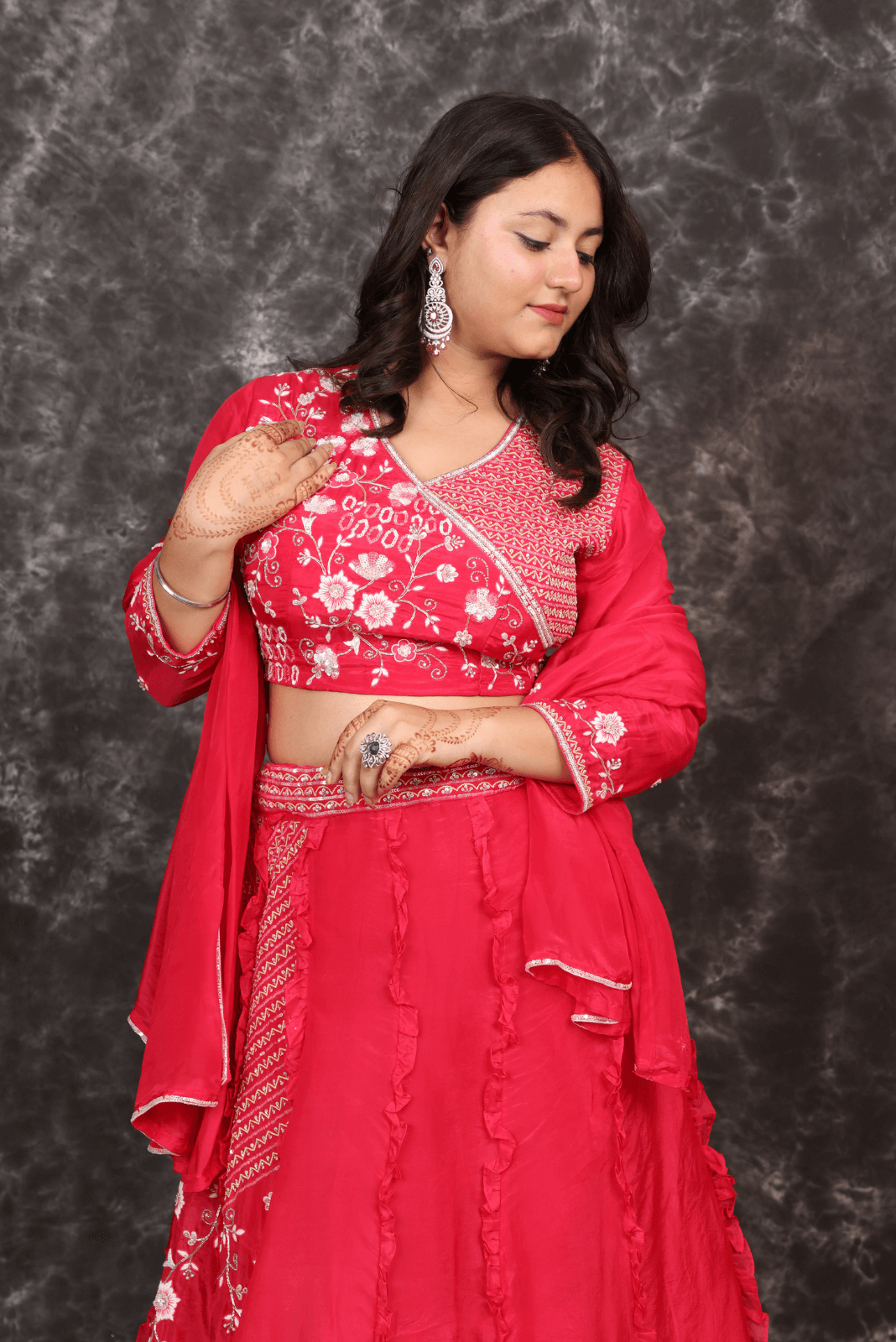 Step into elegance with this stunning Magenta Crepe Crop Top & Skirt Set, paired with a matching Crepe Dupatta. The smooth crepe fabric gives a beautiful fall, making it perfect for festive and special occasions. The vibrant magenta shade adds a bold and stylish touch to your look.