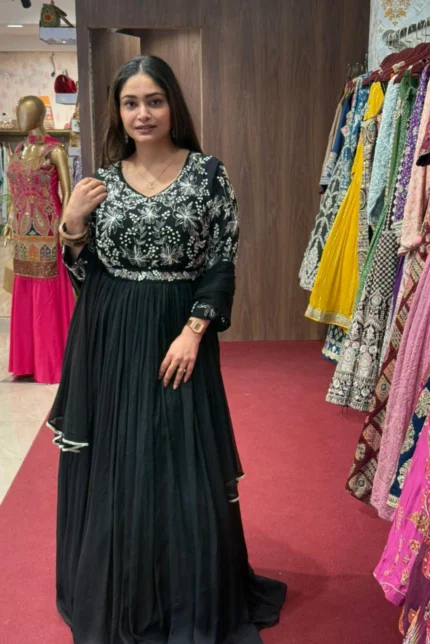 Make a timeless statement with this Elegant Black Designer Gown, crafted from premium Imported fabric for a luxurious fall and graceful silhouette. The classic black shade adds sophistication, making it a perfect choice for evening events and special celebrations.
