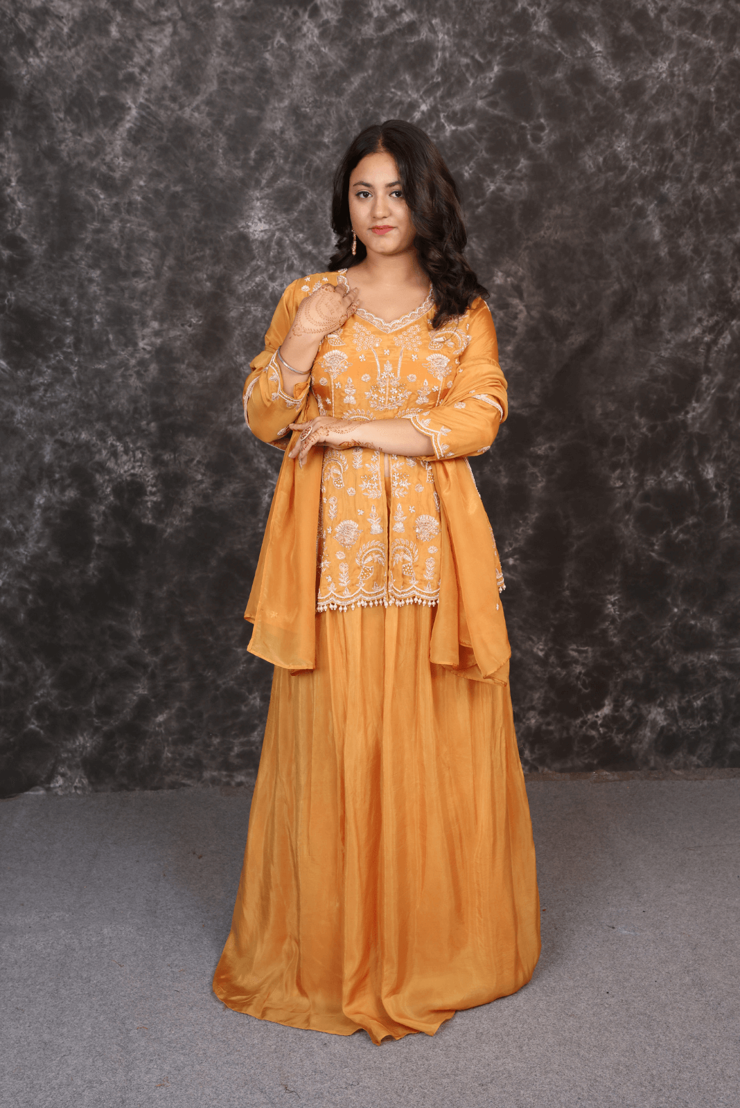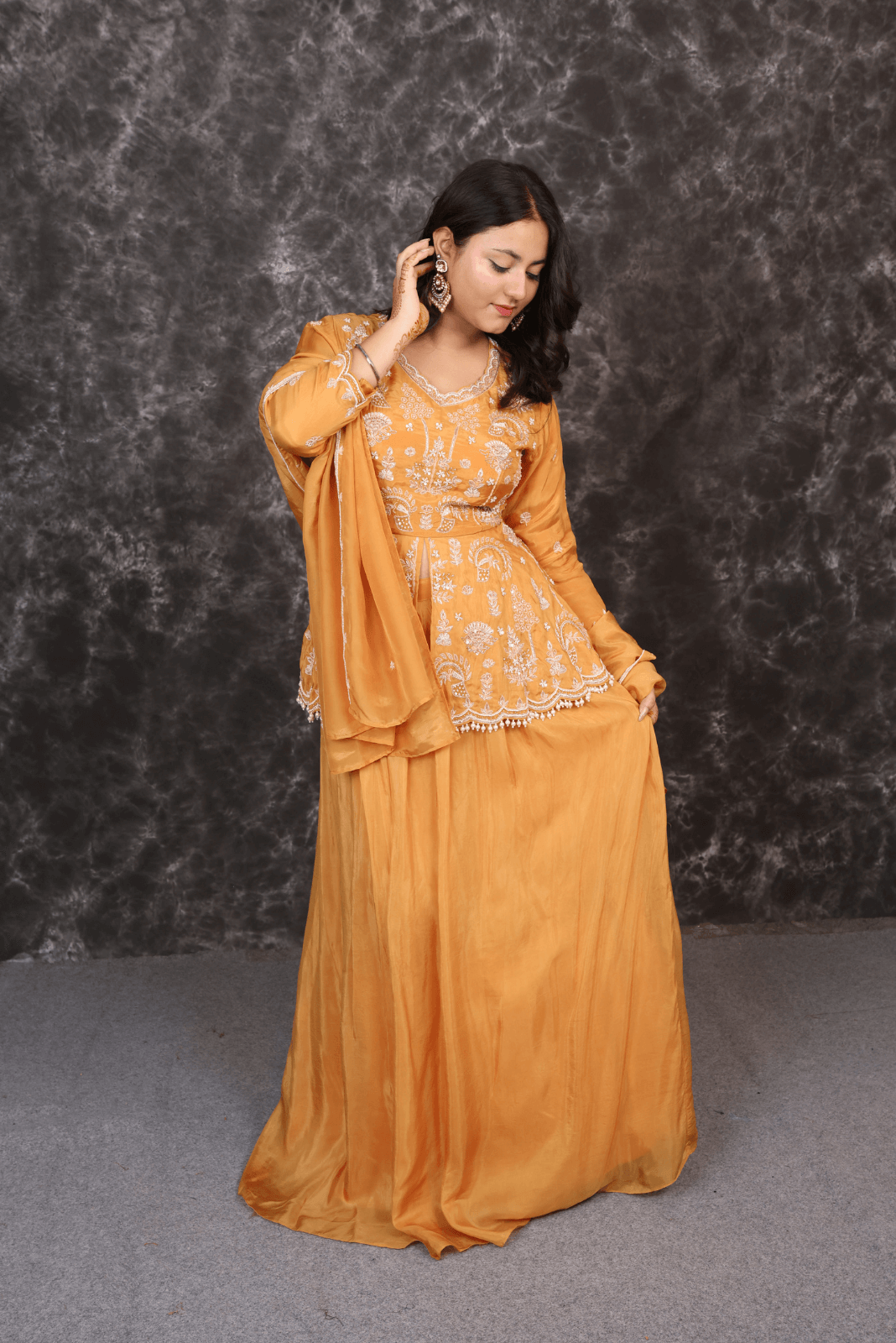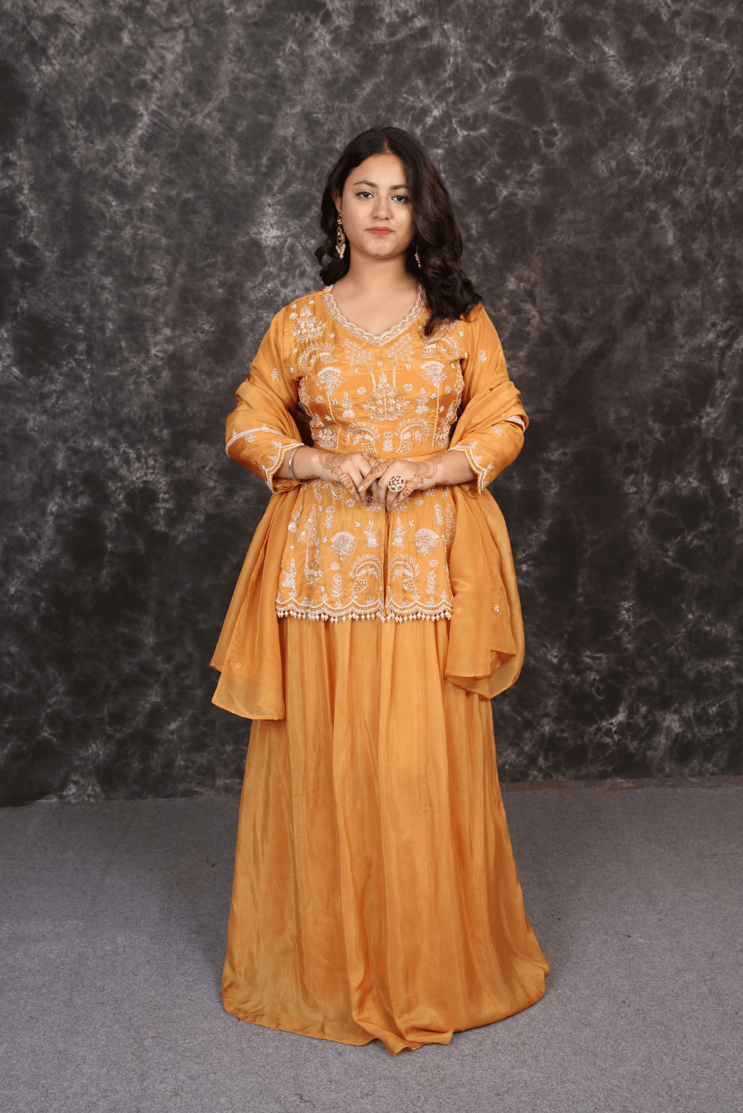 Make a bold festive statement with this stunning Front Slit Short Peplum & Skirt Set, crafted entirely in premium Crepe fabric. The vibrant orange shade adds a refreshing charm, while the stylish front-slit peplum paired with a graceful skirt creates a perfect blend of traditional and contemporary fashion. Completing the outfit is a beautifully draped crepe dupatta for a coordinated and elevated look.