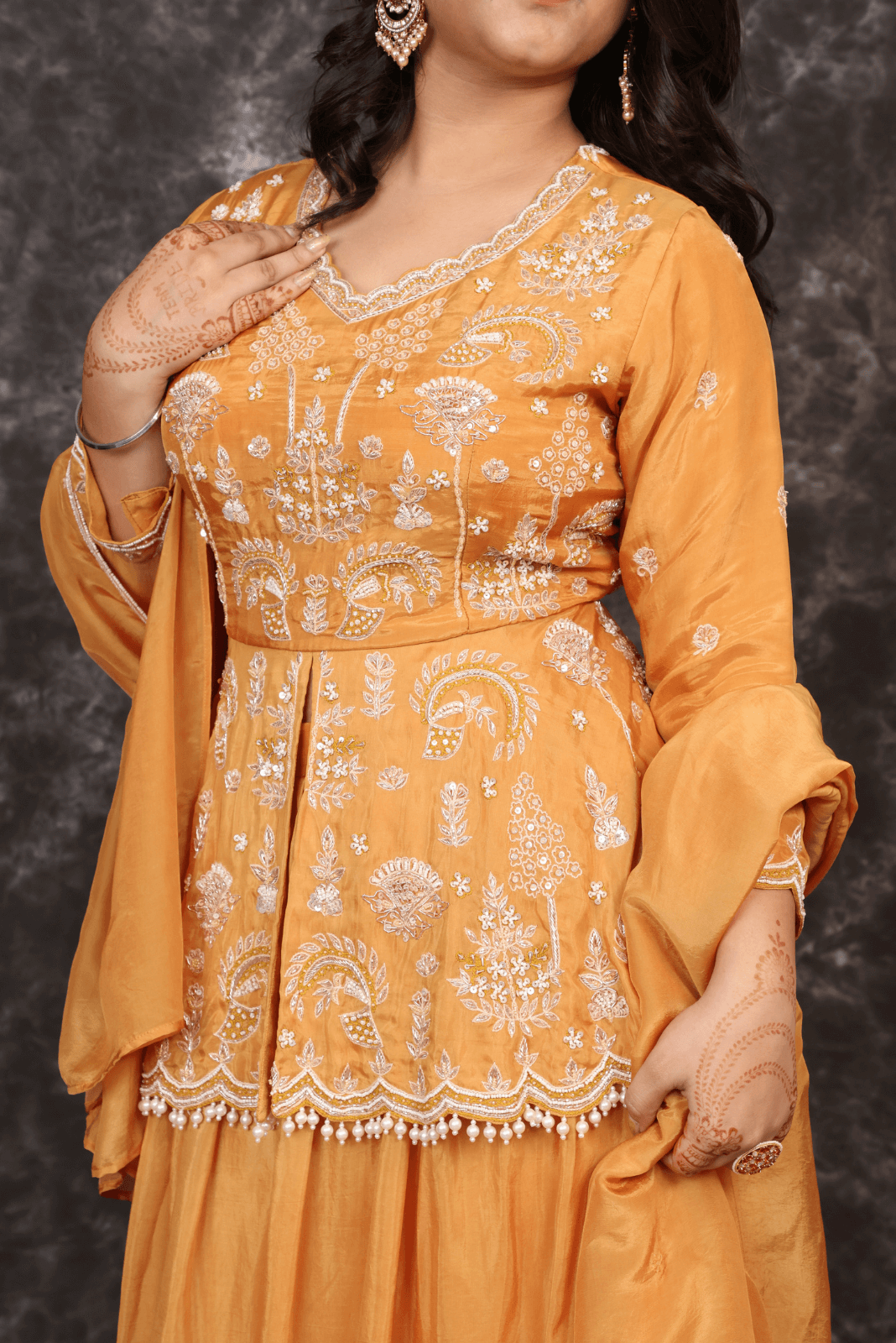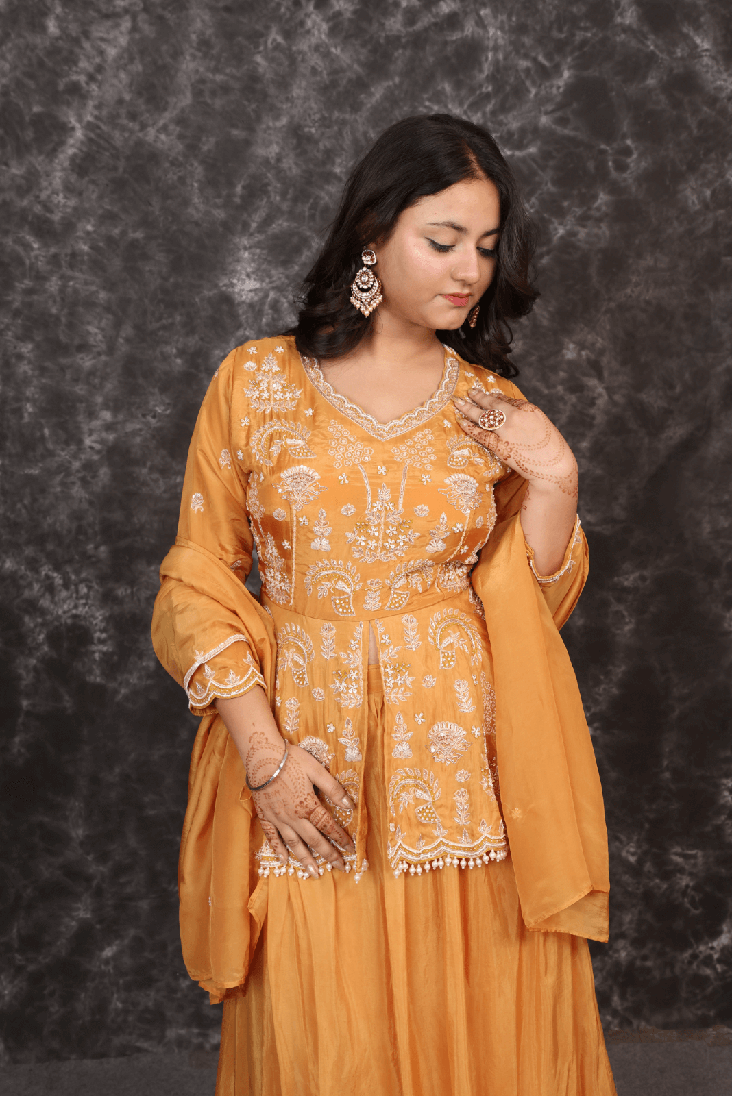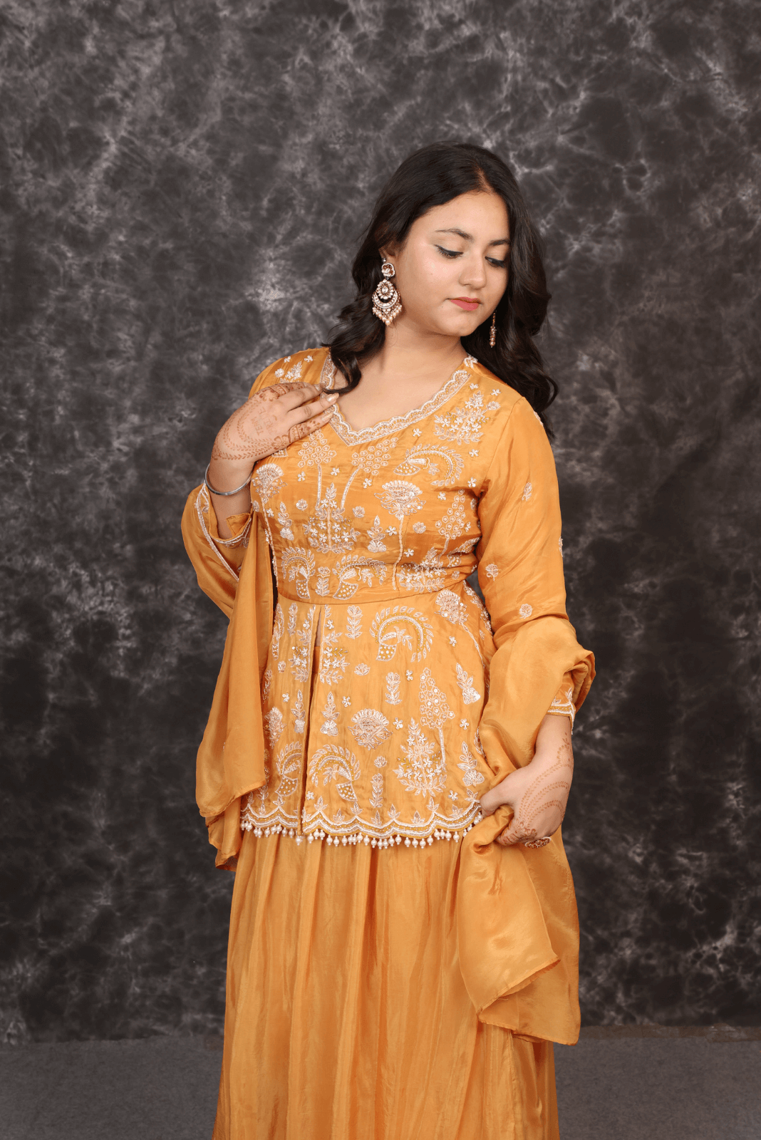 Make a bold festive statement with this stunning Front Slit Short Peplum & Skirt Set, crafted entirely in premium Crepe fabric. The vibrant orange shade adds a refreshing charm, while the stylish front-slit peplum paired with a graceful skirt creates a perfect blend of traditional and contemporary fashion. Completing the outfit is a beautifully draped crepe dupatta for a coordinated and elevated look.