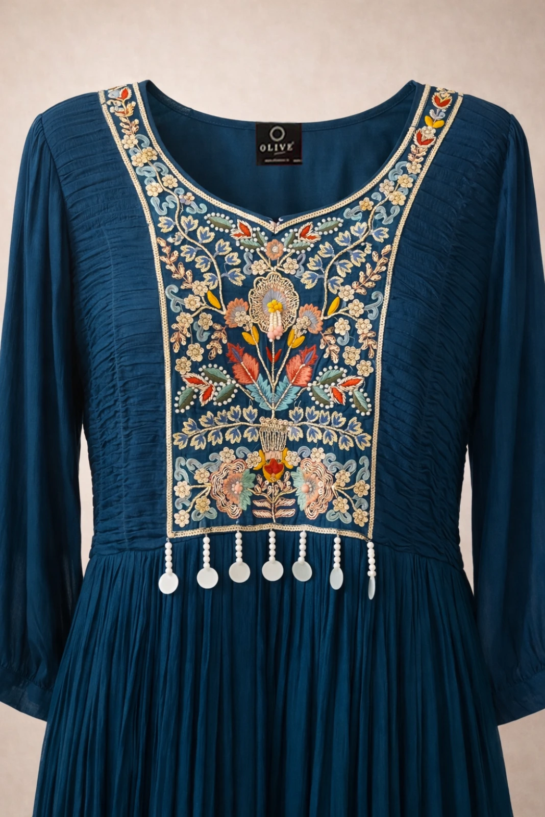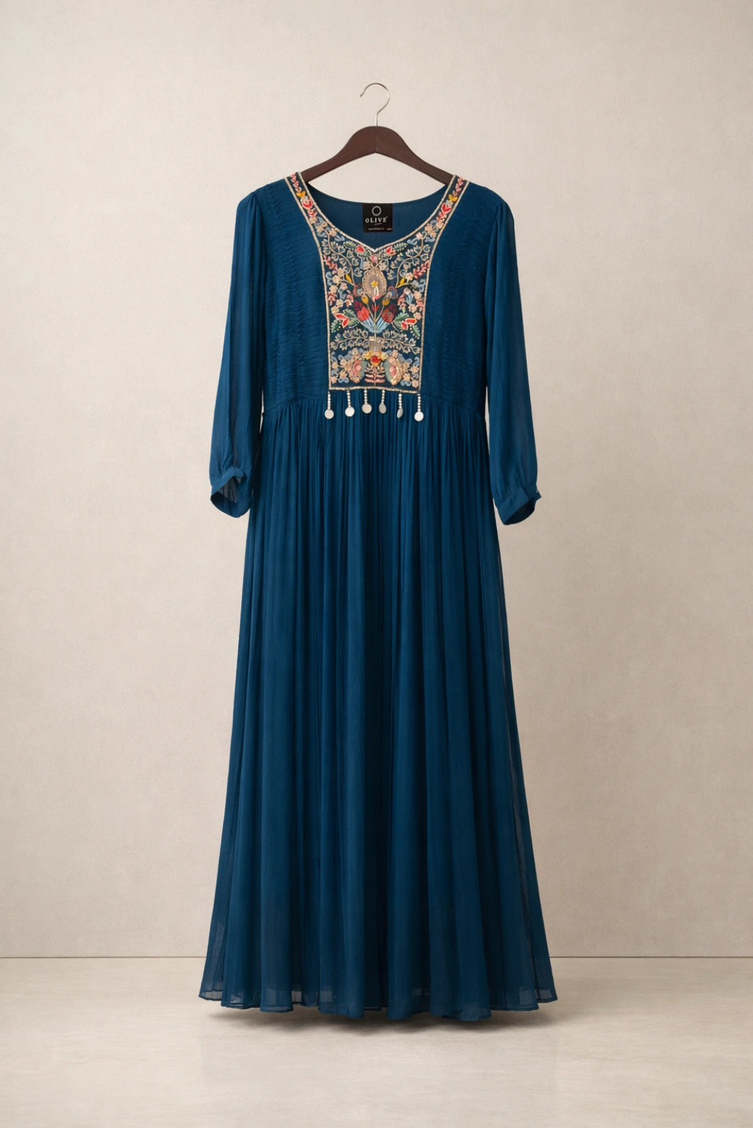 Step into effortless elegance with this Blue Gown paired with a Butterfly Dupatta. Crafted in soft, flowy chinon fabric, the gown drapes beautifully while the butterfly-style dupatta adds a dreamy, graceful touch—perfect for festive evenings, weddings, and special celebrations.