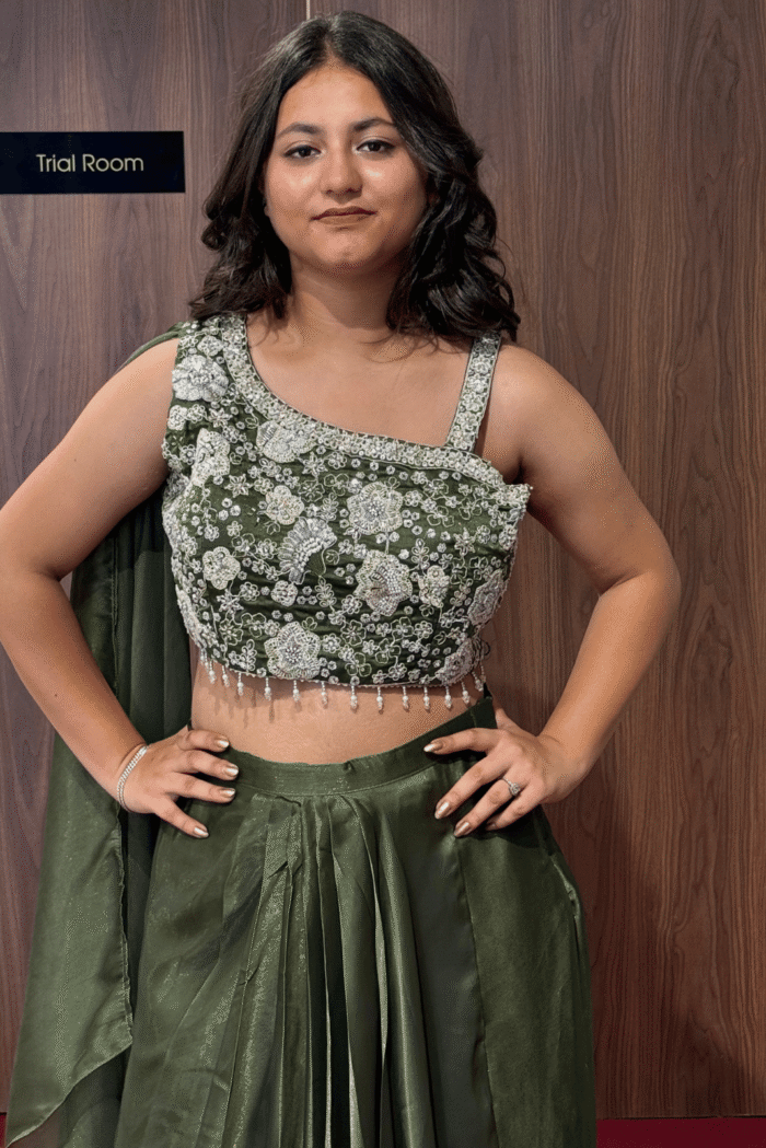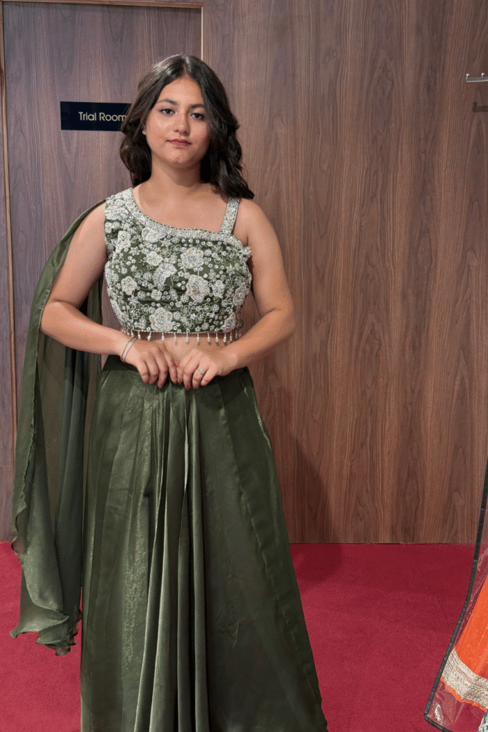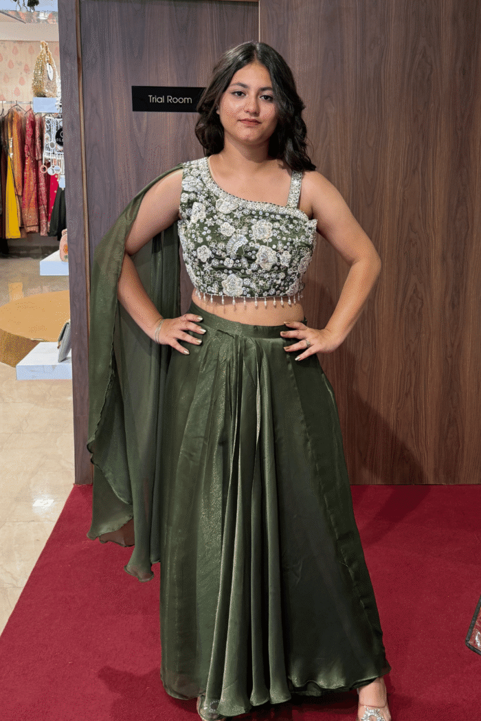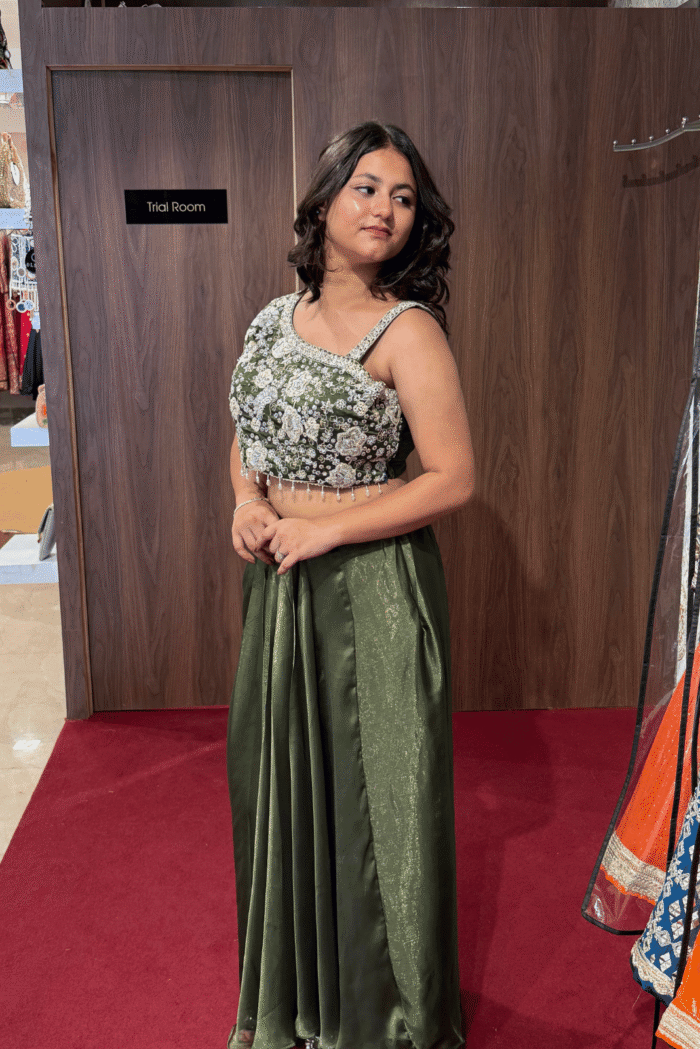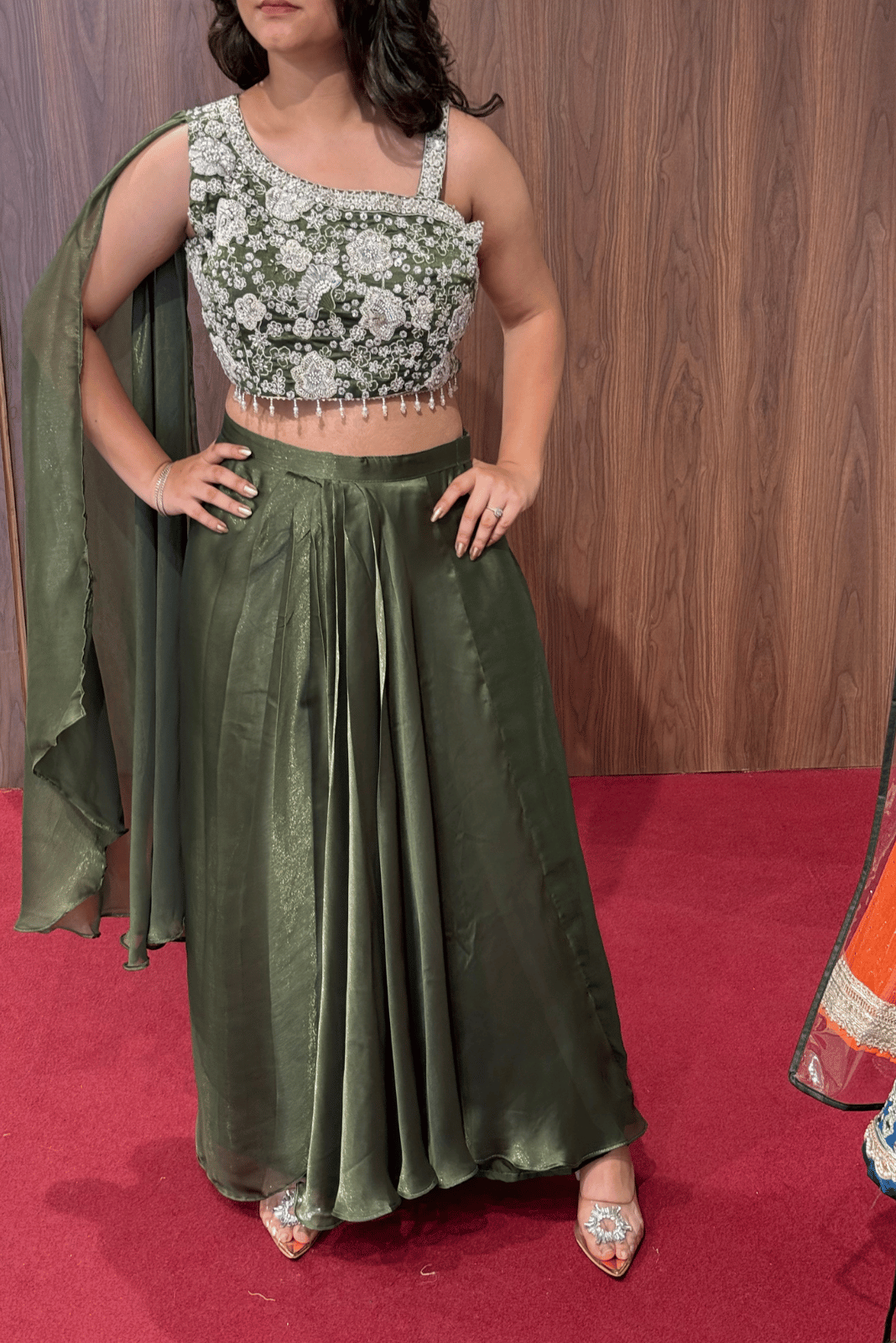 Step into effortless elegance with this stunning green crop top skirt set, crafted from premium imported fabric. The chic crop top paired with a graceful flared skirt makes it a perfect choice for festive nights, cocktail parties, and modern wedding functions. Its rich green hue adds a touch of sophistication while keeping the look trendy and timeless.