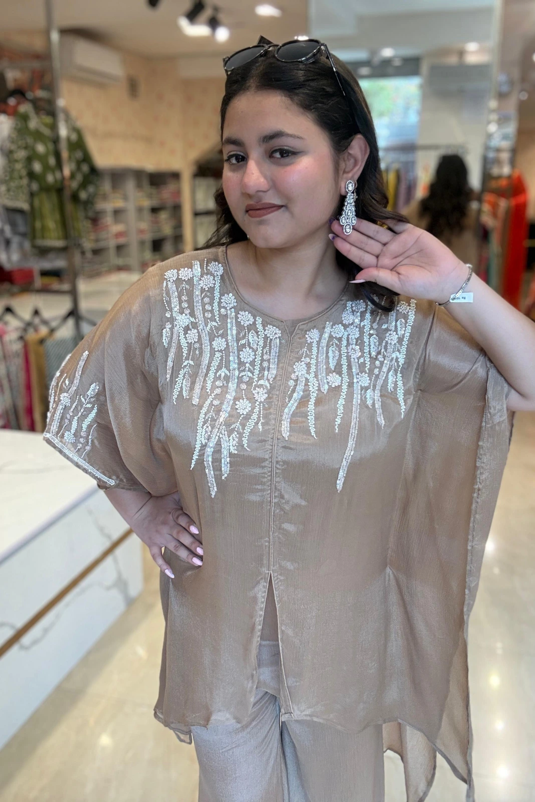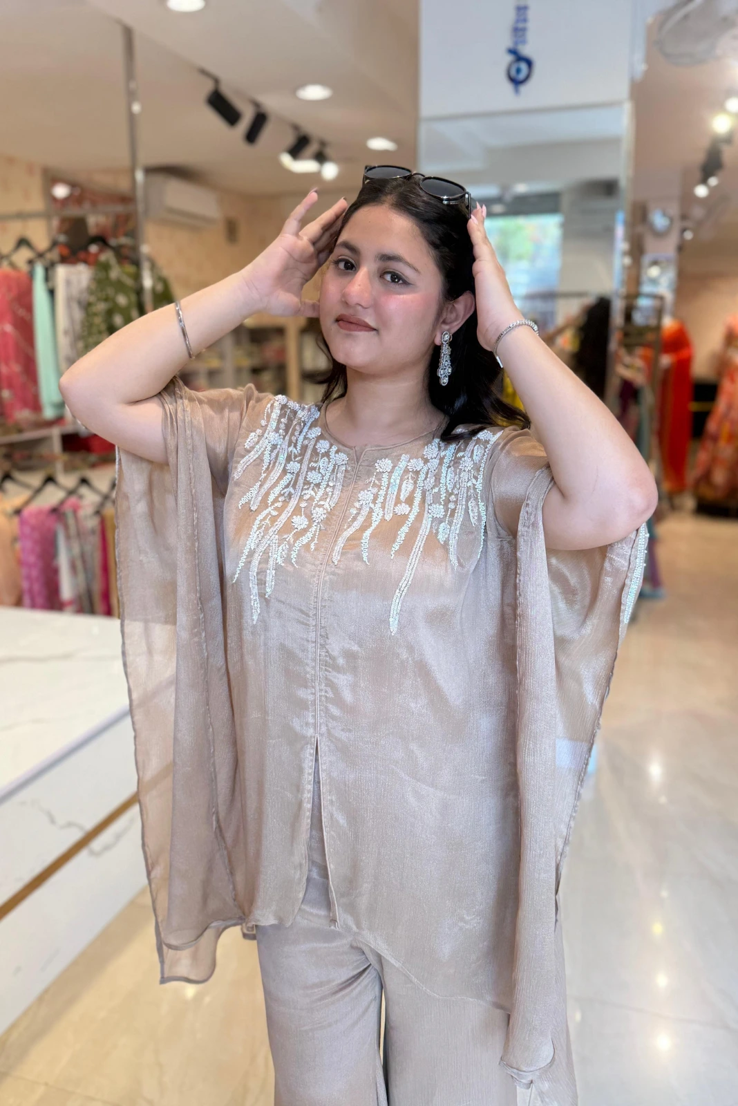 Kaftan: Stylish chinon kaftan that adds a relaxed yet statement layer to the outfit.