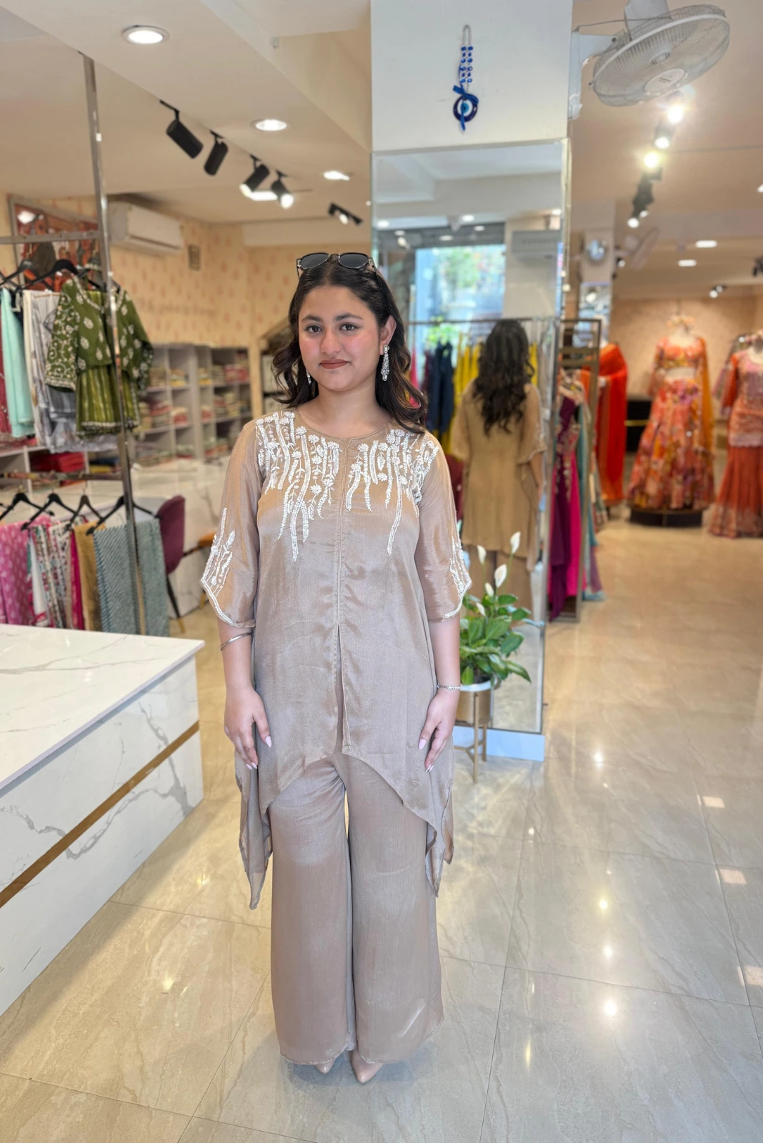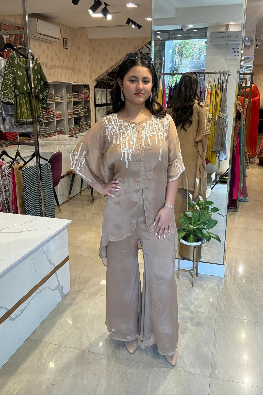 Step into luxe elegance with our Kaftan with Crop Top & Plazo Set — a statement ensemble that blends comfort with contemporary glamour. Designed in a radiant golden hue, this outfit features a stylish crop top and flowy plazo, layered with a chic kaftan that adds effortless drama and movement. Crafted entirely in soft chinon fabric, it offers a graceful drape with a subtle sheen.