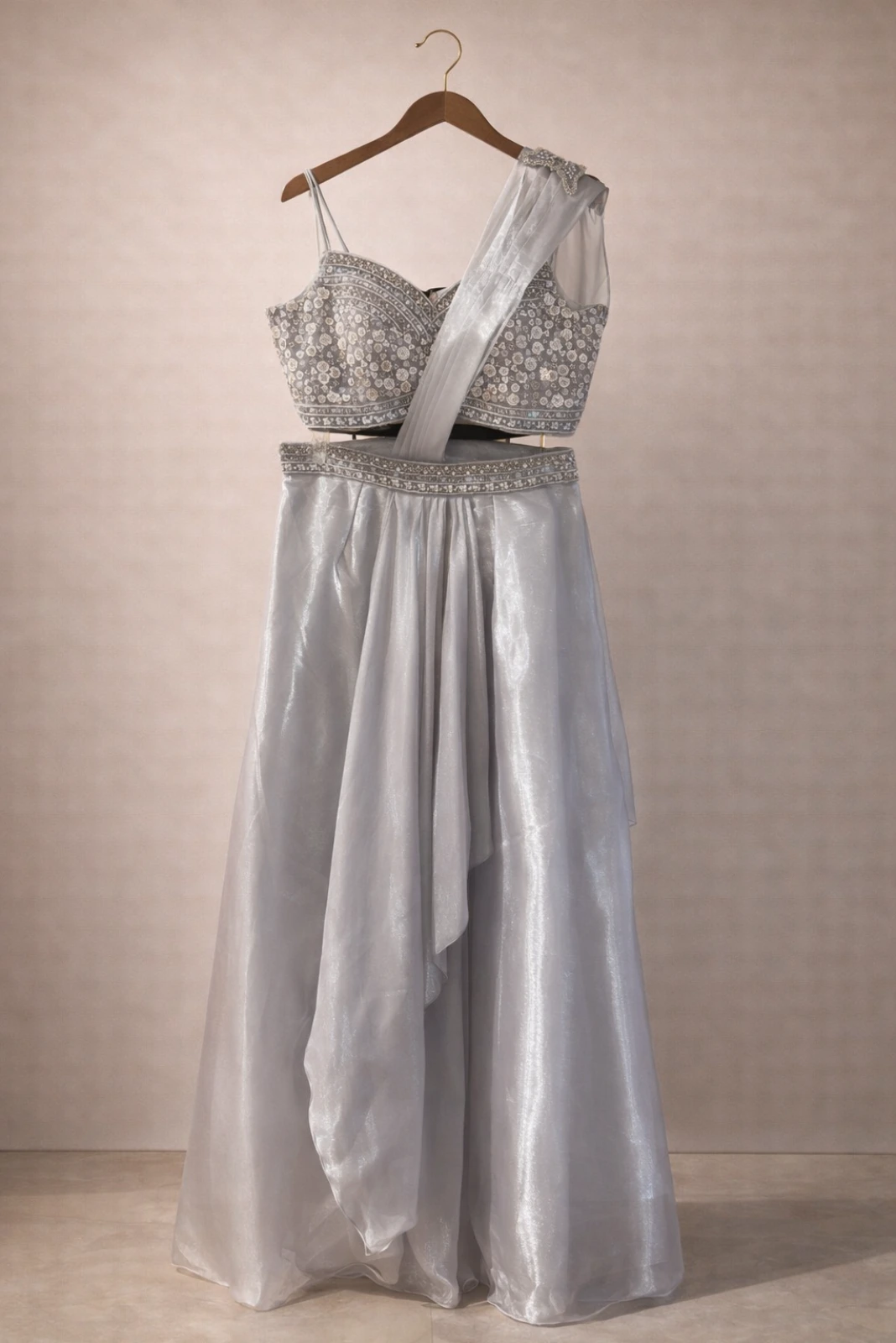 This Lavender Top Drape Saree is crafted for modern celebrations with a touch of sophistication. The premium Jimmychoo fabric offers a luxurious feel and graceful drape, while the coordinated top and skirt enhance the overall elegance. Ideal for festive occasions, parties, and wedding functions, this outfit ensures a striking and stylish look.