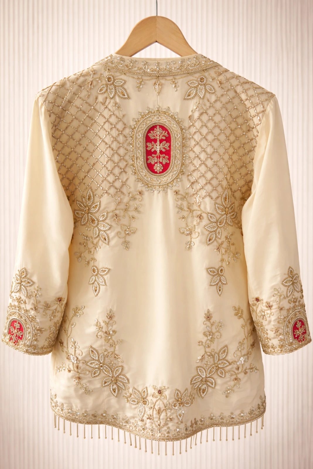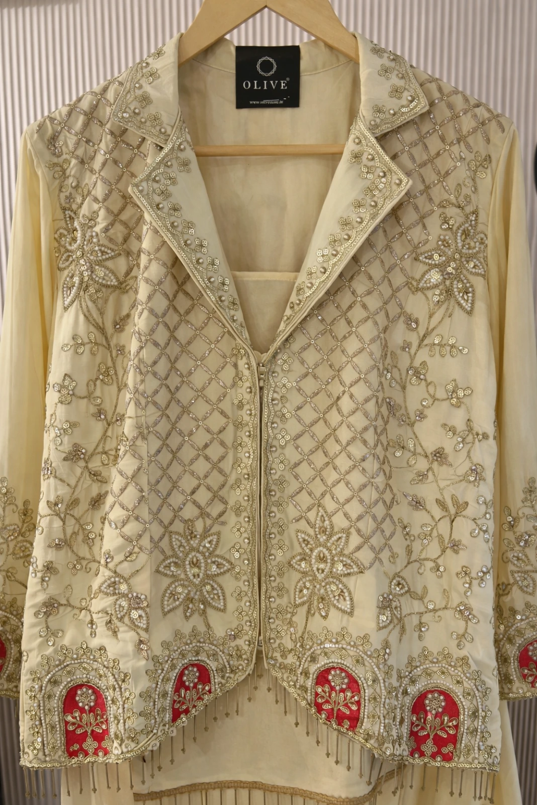 This Off-White Short Jacket & Skirt Dress is designed for effortless sophistication. Crafted entirely in premium crepe fabric, the outfit features a stylish short jacket layered over a matching inner top and skirt. The soft off-white colour adds timeless charm, making it an ideal choice for festive gatherings, parties, and elegant daytime or evening events.