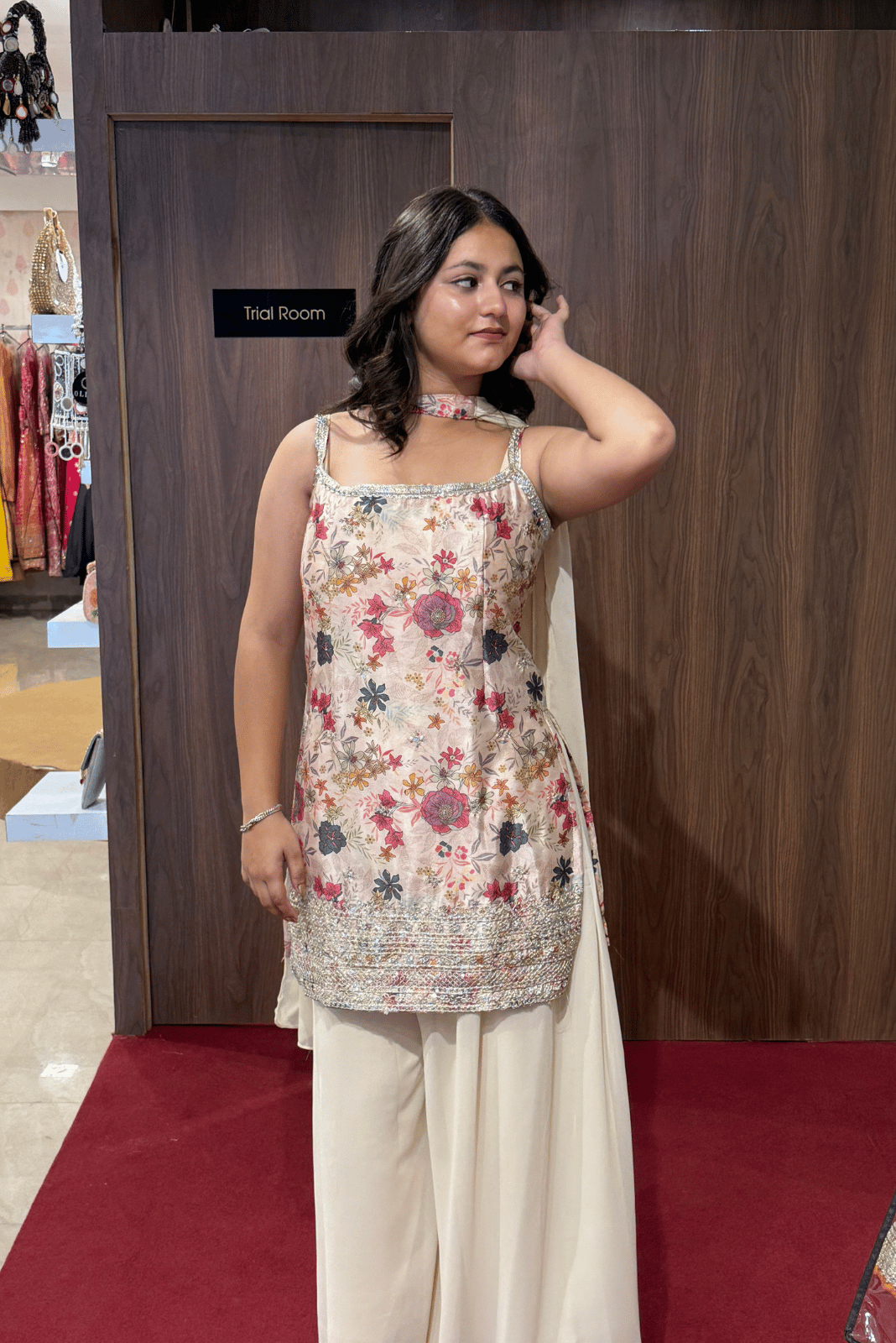 Delicate and dreamy, this off-white short kurti plazo set exudes timeless sophistication. The chinon kurti paired with flowy georgette plazo offers a graceful silhouette, while the butterfly-style dupatta adds a touch of dramatic charm. Perfect for festive occasions, engagements, or elegant evening gatherings, this ensemble is all about understated glamour and effortless style.
