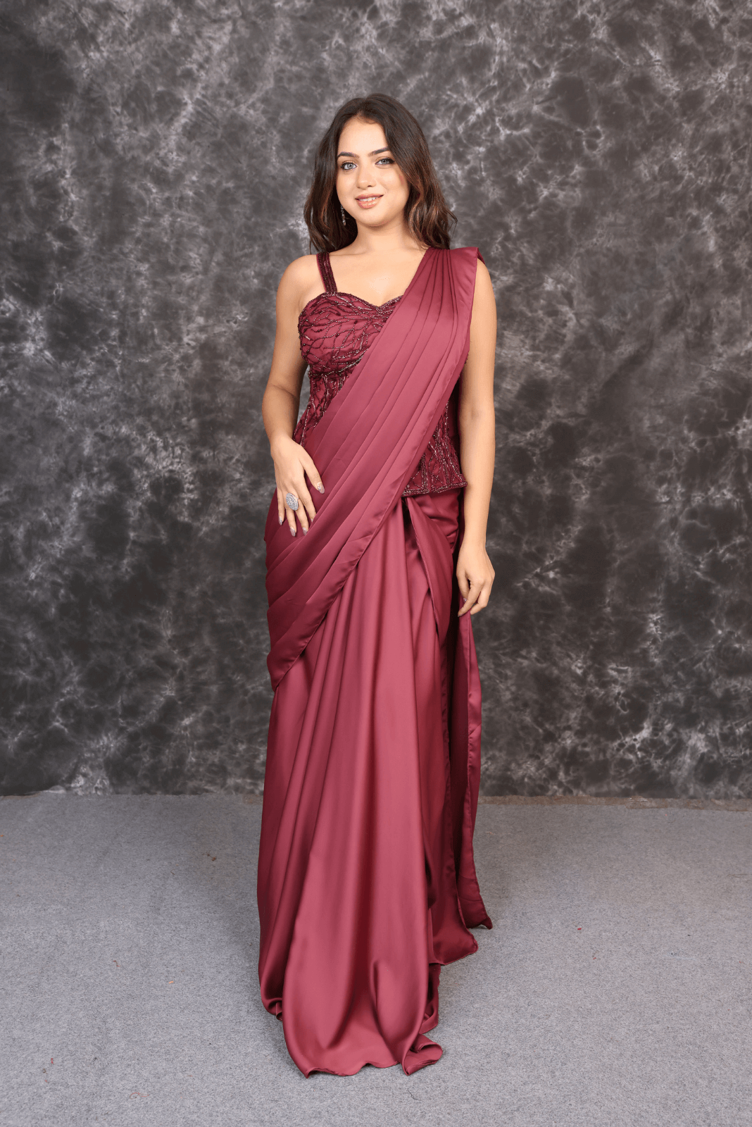 Step into the spotlight with this stunning Onion Pink Corset Drape Dress, designed to blend elegance with contemporary flair.