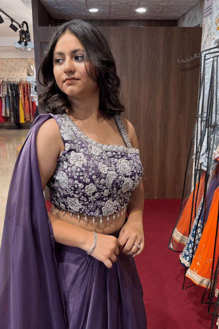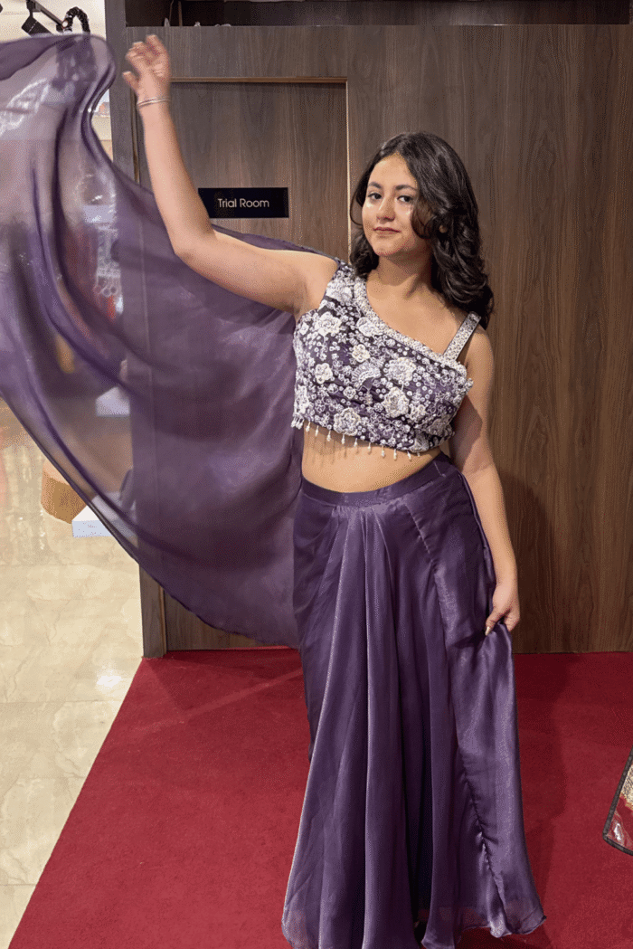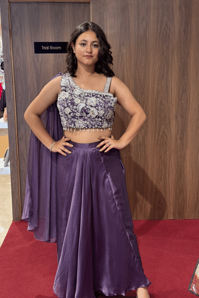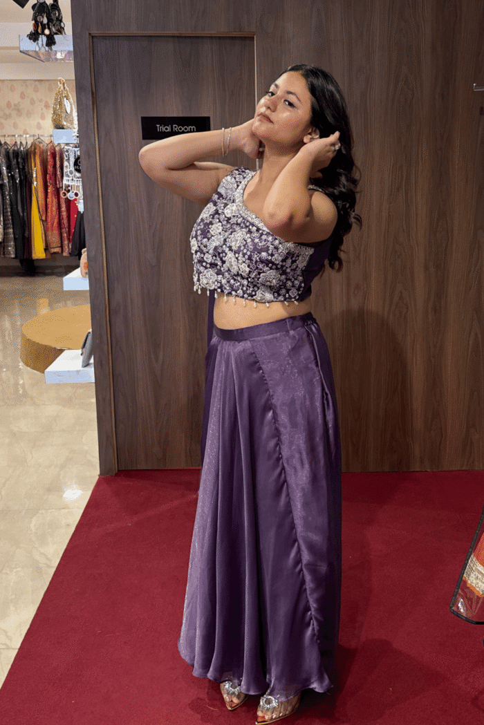 Turn heads with this stunning purple crop top skirt set, designed to add a touch of glamour to your festive and party wardrobe. Crafted from premium imported fabric, the outfit beautifully combines a chic crop top with a flowy skirt, offering the perfect blend of modern elegance and comfort. Its rich purple hue makes it an eye-catching ensemble for evening occasions, cocktail parties, and wedding festivities.