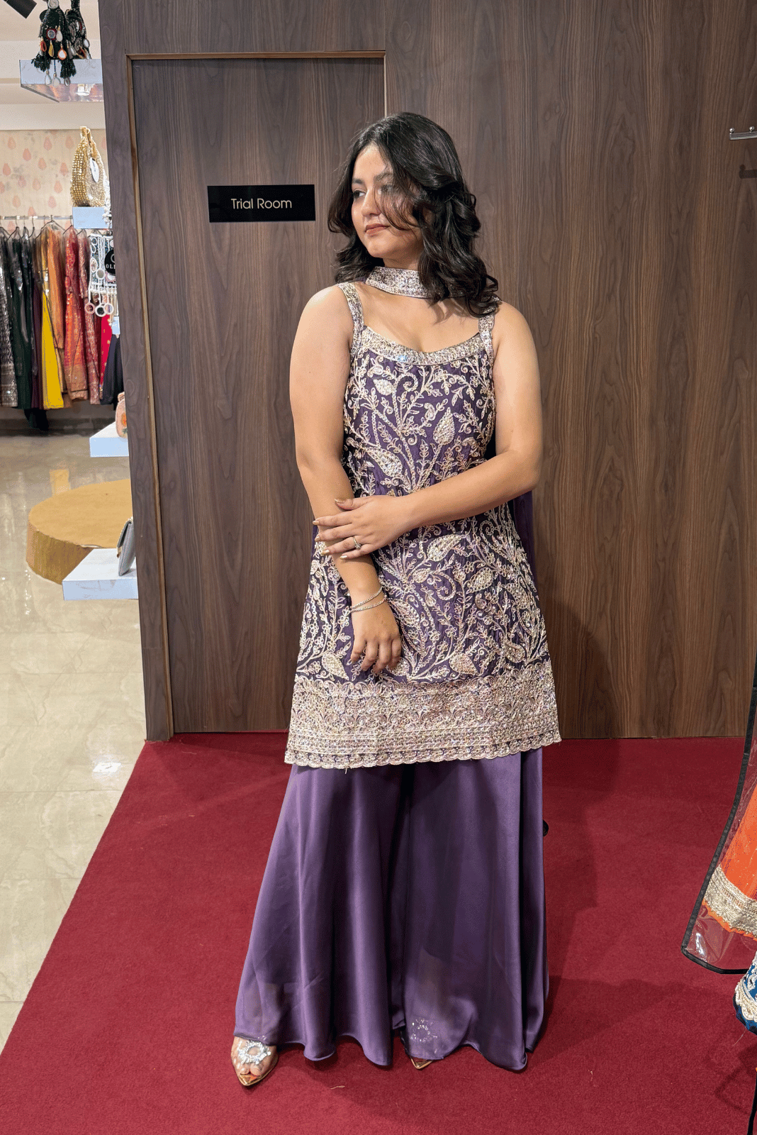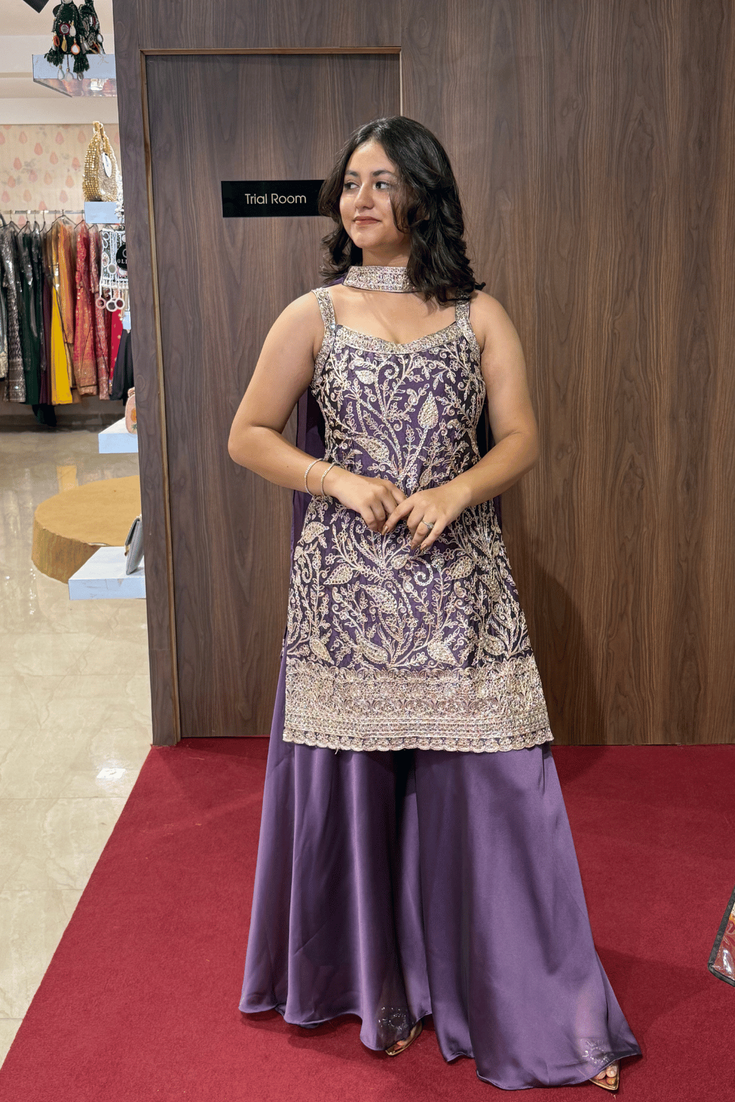 Step into elegance with this royal purple short kurti plazo set, designed to make every occasion special. Crafted in flowy georgette, the outfit ensures effortless grace with a youthful charm. The butterfly-style dupatta adds a modern twist to the traditional ensemble, making it perfect for festive evenings and chic celebrations.