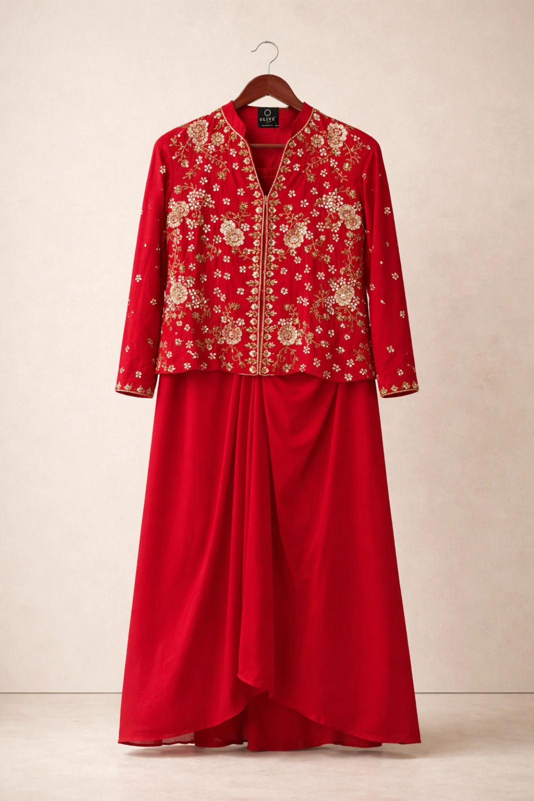 Turn heads in this Red Short Jacket & Skirt Dress, crafted in rich dola silk that adds a royal touch to your festive wardrobe. The structured short jacket paired with a graceful skirt creates a perfect blend of tradition and modern elegance—ideal for weddings, festive gatherings, and special occasions.