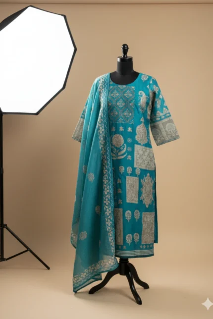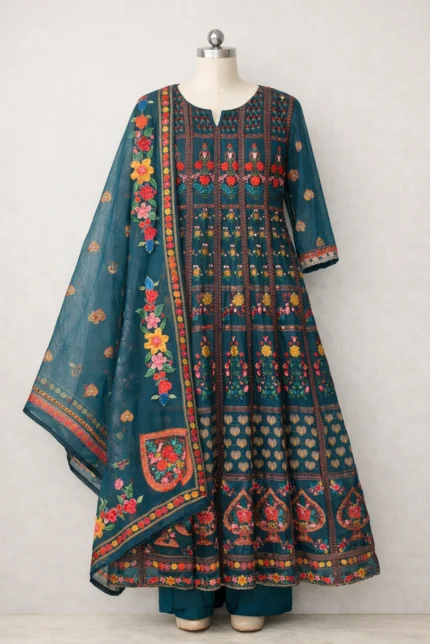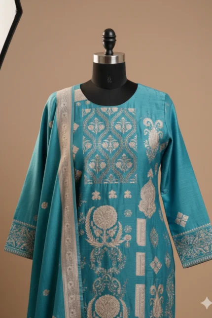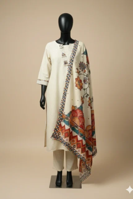 This Rust Katha Work Suit reflects timeless elegance with intricate Katha work on breathable linen fabric. The kurti offers a refined and structured look, while the cotton pants ensure comfort throughout the day. Paired with a coordinated linen dupatta, this ensemble is ideal for festive occasions, cultural gatherings, and elegant day functions.