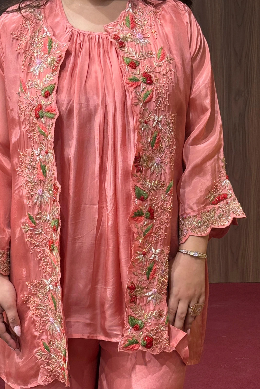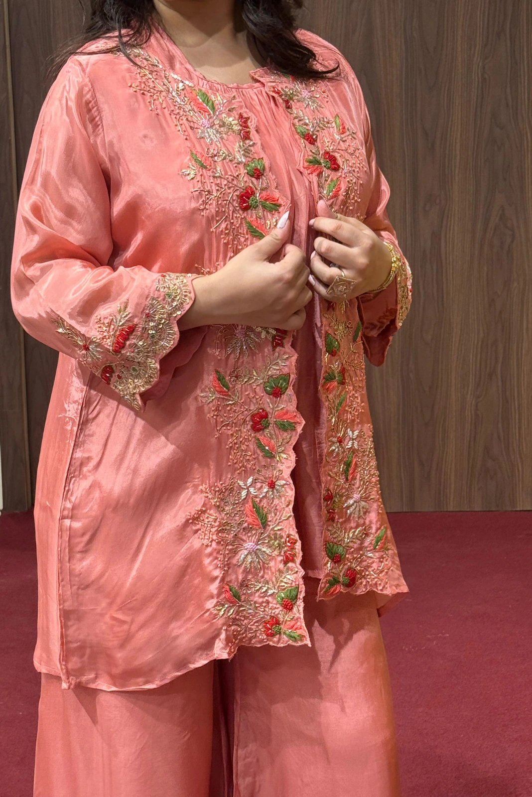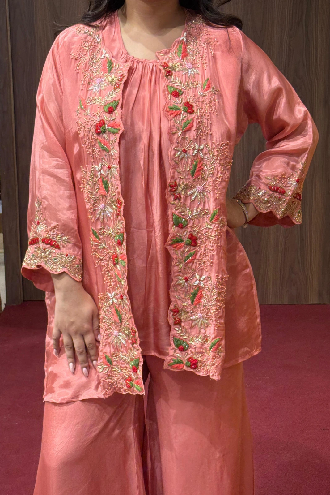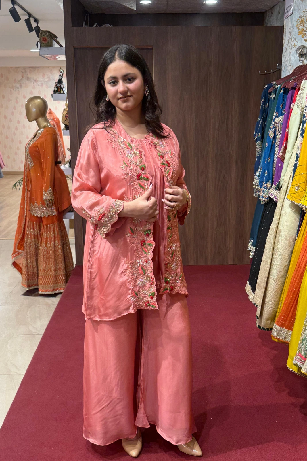 Step into soft sophistication with our Short Inner Jacket with Plazo Dress — a beautifully coordinated ensemble that blends comfort with contemporary ethnic style. Designed in a soothing peach tone, this outfit features a layered look with a short inner, a structured jacket, and a flowy plazo, all crafted in smooth crepe fabric for a refined finish.