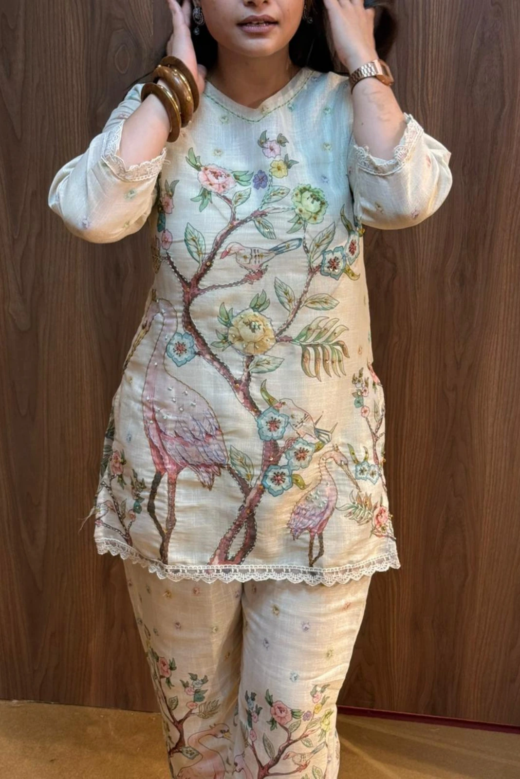 Kurti: Short linen kurti adorned with Katha work and delicate sequence detailing, offering a graceful and artisanal appeal.